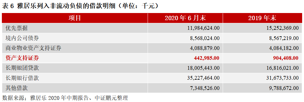 案例8:雅居樂下屬商業(yè)物業(yè)運(yùn)營子公司于2018年4月發(fā)行CMBS“華西證券-雅居樂國際廣場商業(yè)物業(yè)資產(chǎn)支持專項(xiàng)計(jì)劃”,公司為專項(xiàng)計(jì)劃擔(dān)保人,發(fā)行規(guī)模合計(jì)46億元,在扣除發(fā)行成本及公司認(rèn)購的專項(xiàng)計(jì)劃次級規(guī)模后,計(jì)入公司“借款”下“商業(yè)物業(yè)資產(chǎn)支持證券”科目,見表6。