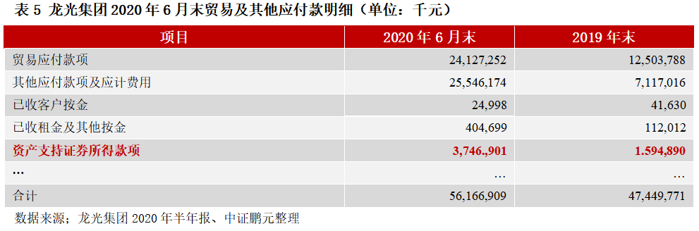 案例4:龍光集團(tuán)有限公司(以下簡稱“龍光集團(tuán)”)下屬深圳市龍光控股有限公司發(fā)行“西南證券-龍光地產(chǎn)購房尾款資產(chǎn)支持專項(xiàng)計(jì)劃”,在公司報(bào)表中計(jì)入“貿(mào)易及其他應(yīng)付款”下“資產(chǎn)支持證券所得款項(xiàng)”科目。