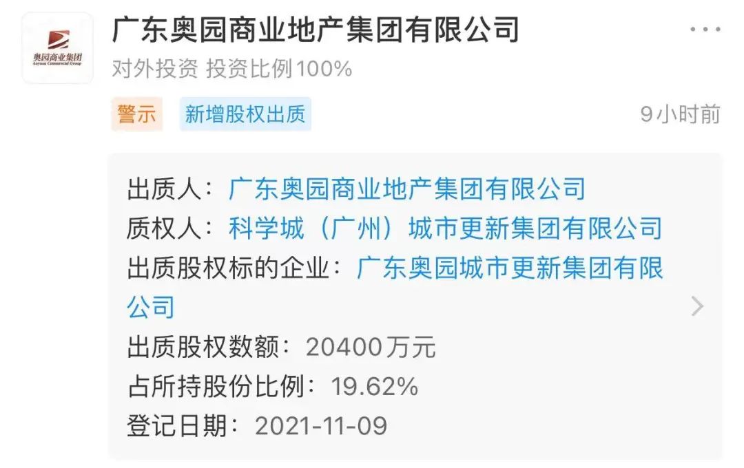 工商資料顯示,11月9日,奧園孫公司廣東奧園商業(yè)地產(chǎn)集團有限公司,將所持廣東奧園城市更新集團有限公司10%的股權(quán)質(zhì)押給科學城(廣州)城市更新集團有限公司。
