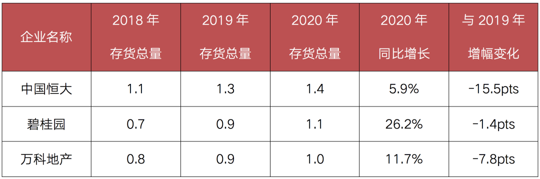 從企業角度而言,截至2020年底,存貨規模達到萬億的房企有三家,分別是恒大1.4萬億元、碧桂園1.1萬億元和萬科1萬億元,其中碧桂園和萬科是首次進入萬億行列。