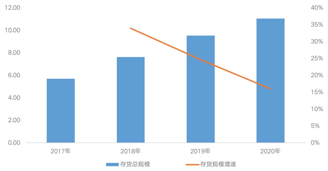 存貨總量及存貨同比增速(單位:萬億元)