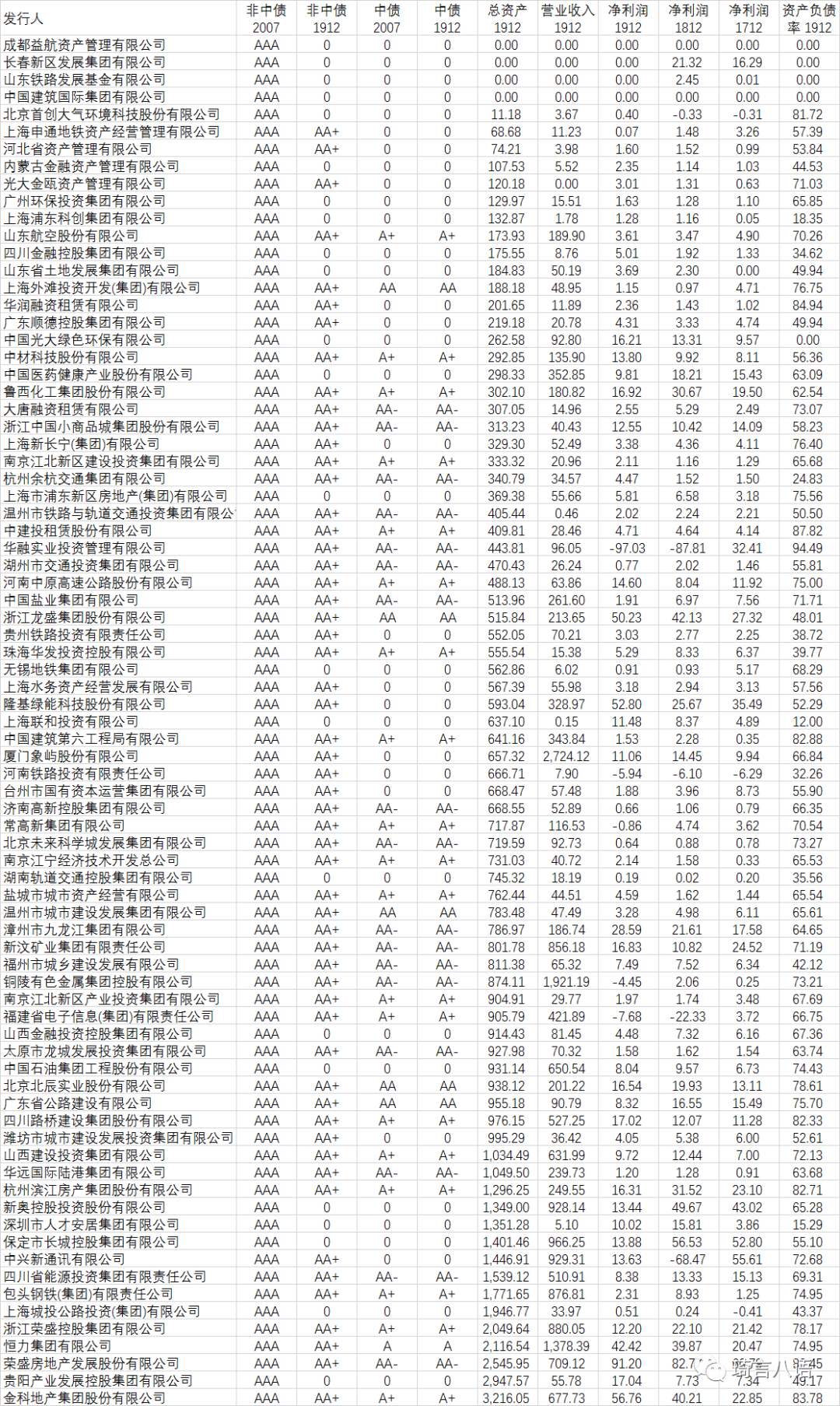 可以看出,其中有多家企業的總資產不足二百億,甚至不到一百億,記得以前AA+的資產規模門檻都有二百億的: