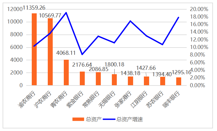 縱觀10家上市農商行的總資產情況,渝農商行和滬農商總資產規模均突破萬億,青島農商行位居第三,與前兩名之間還存在很大差距。但在總資產增速上,青島農商行已經達到19.07%,遠超其他農商行。滬農商行盡管資產規模已破萬億,但仍在繼續趕超,其總資產增速為13.66%,超過渝農商行的10.31%,渝農商行若要保持領先地位,或將面臨較大壓力。