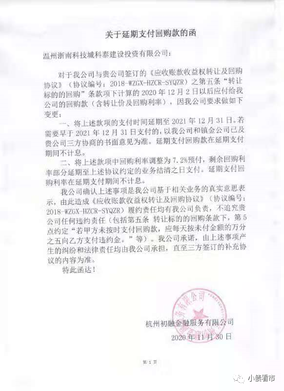 《小債看市》獲得的《關于延期支付回購款的函》顯示,2020年12月2日以后科泰建投應付給杭州初融的回購款,延期至2021年12月31日支付。