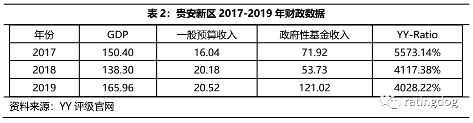 貴安新區(qū)經(jīng)濟(jì)水平較差,財(cái)政實(shí)力弱,債務(wù)負(fù)擔(dān)非常重。2017-2019年,貴安新區(qū)的地區(qū)生產(chǎn)總值和一般預(yù)算收入增長(zhǎng)緩慢,年復(fù)合增長(zhǎng)率為5.05%,一般預(yù)算年復(fù)合增長(zhǎng)率為13.1%。原因在于貴安新區(qū)的大數(shù)據(jù)工程大部分尚在建設(shè)過(guò)程中,未投入運(yùn)營(yíng),新區(qū)又對(duì)招商引資的企業(yè)進(jìn)行了稅收減免,致使一般預(yù)算收入較低。而政府性基金收入在19年有較大幅度的增長(zhǎng),較上一年增長(zhǎng)125.24%。貴安新區(qū)的YY-Ratio更是驚人之高,盡管近年來(lái)逐步下降,2019年還是處在4028.22%的高位,但結(jié)合貴安新區(qū)的城建和產(chǎn)業(yè)發(fā)展進(jìn)程,也在情理之中。