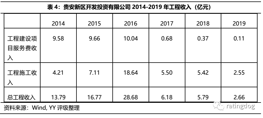 具體業(yè)務(wù)方面,安置房銷(xiāo)售是公司2017年新增的業(yè)務(wù),為委托代建模式,由土儲(chǔ)中心將安置房項(xiàng)目委托給公司代建,待建成后按照“成本+稅費(fèi)+利潤(rùn)”的定價(jià)原則由土儲(chǔ)中心付款。作為新區(qū)最主要的基建開(kāi)發(fā)主體,公司的工程施工業(yè)務(wù)可反映新區(qū)的基建進(jìn)度安排。2016-2019年,公司工程施工業(yè)務(wù)板塊新簽合同總額分別為1.81億、26.57億、2.45億和2.07億??梢钥闯?,公司打算新造的工程項(xiàng)目在2017年后大幅下降。公司的工程收入16年最高達(dá)到28.68億,之后大幅下降,也可同步印證得出,貴安新區(qū)的基建工程建造的腳步在大幅放緩。