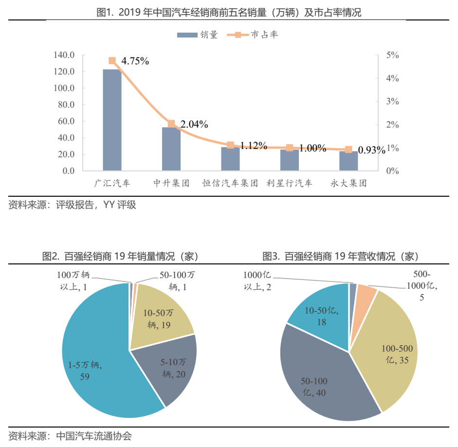 具體到企業(yè),2019年,連續(xù)多年蟬聯(lián)第一的廣匯汽車銷量為122.5萬輛,市占率也僅為4.75%。中升集團、上海汽車工業(yè)銷售集團分別排名第二、第三,銷量分別為52.7萬輛、42.2萬輛,市占率分別為2.04%、1.12%。銷量超過10萬輛的經(jīng)銷商合計21家。營收方面,19年有廣匯集團、中升集團兩家跨入千億,超過100億元的經(jīng)銷商合計有42家。