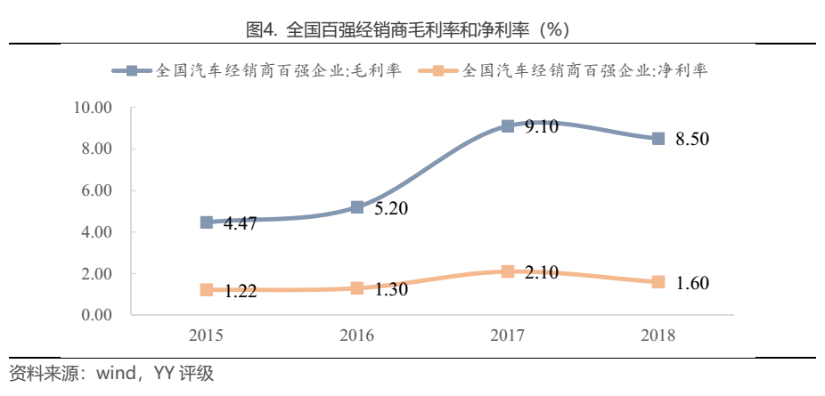雖然新辦法打破了授權(quán)單一體制,但汽車廠商仍然通過供貨、返利等方式控制了銷售渠道,且會去4S店購車的人往往也是沖著官方授權(quán)以及汽車使用周期內(nèi)的全方位服務體驗去的,因此品牌授權(quán)仍是4S店的主要銷售形式。當前汽車經(jīng)銷商對于購銷兩頭的議價能力都較弱,廠商通常在制定指導零售價時給予經(jīng)銷商 4~6%的購銷差價空間。由于行業(yè)競爭激烈,經(jīng)銷商往往將大部分購銷差價讓利給客戶以爭奪客源,利潤空間進一步被壓縮,因此銷售利潤非常依賴于廠商后期提供的銷售返點,甚至出現(xiàn)為了獲得返利超負荷拿車、價格倒掛的情況。
