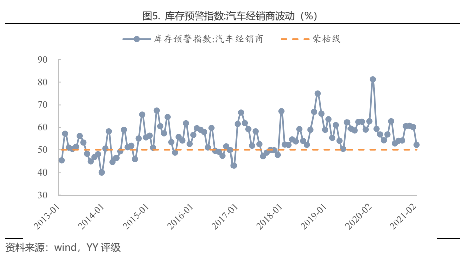 經(jīng)銷商庫存預警指數(shù)是庫存滯留資金/流通資金,以50%為榮枯線,2015年以來我國經(jīng)銷商庫存預警指數(shù)平均值為57.0%,長期位于榮枯線以上,意味著庫存壓力長期較大。2020年2月,受疫情影響,汽車銷路不暢,4S店庫存積壓,庫存預警指數(shù)達到81.2的%的歷史高點,隨后隨著疫情緩解,汽車銷量恢復,庫存指數(shù)有所回落。至2021年2月,即傳統(tǒng)淡季,庫存預警指數(shù)落至52.2%,已經(jīng)低于往年2月份的預警指數(shù),短期進入相對安全區(qū)間。