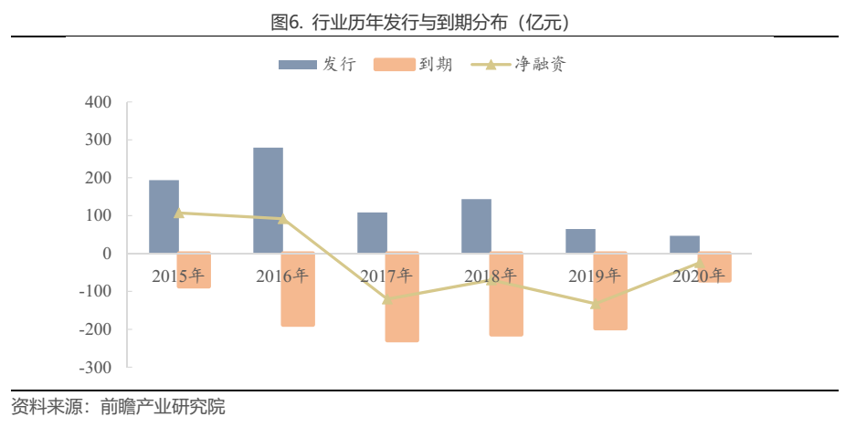 經(jīng)歷2015年、2016年兩年大規(guī)模融資,自2017年以來,汽車銷售行業(yè)凈融資額持續(xù)為負,或與近些年來汽車銷售增速放緩,汽車銷售企業(yè)減緩拓展4S店的步伐,從而資金需求減弱所致。2020年,行業(yè)債券發(fā)行額與到期額均大幅減少,僅發(fā)行46.7億元(其中34億元都是由廣匯集團及其子公司發(fā)行),到期70.7億元,凈融資規(guī)模為-24.0億元??傮w來說,債券市場對于汽車銷售行業(yè)并不友好。