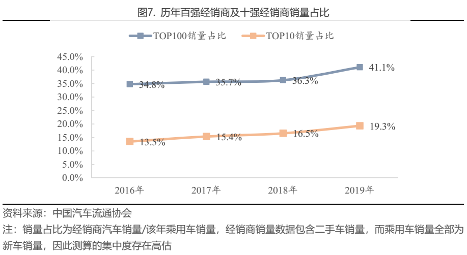 雖然目前汽車銷售行業(yè)仍呈現(xiàn)“大群體、小個體”的狀態(tài),但近些年來的集中度提升是顯著的,尤其是前十名經(jīng)銷商的集中度由2016年的13.5%提升至2019年的19.3%。