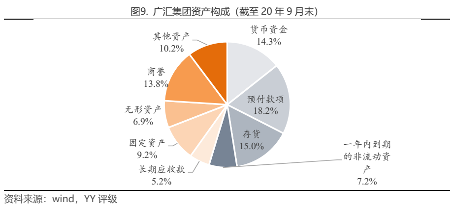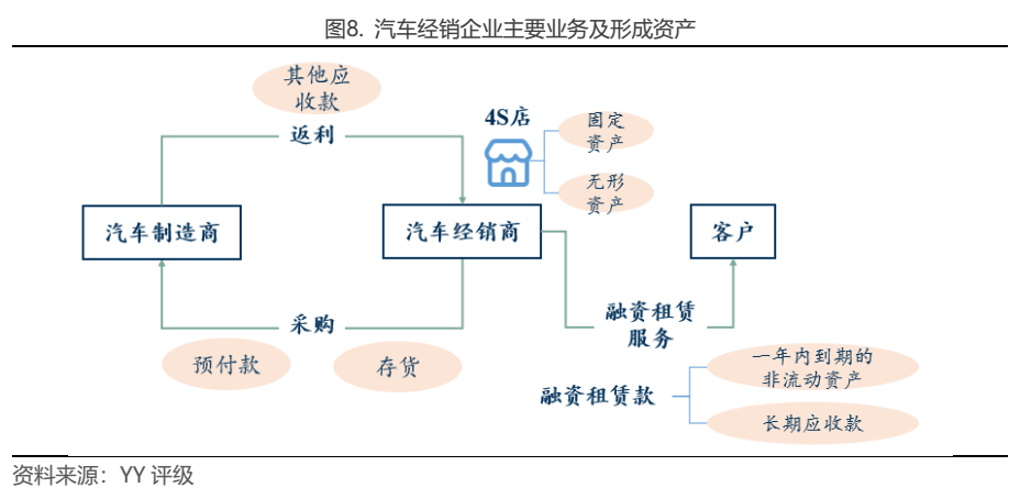 從汽車經(jīng)銷公司的資產(chǎn)構(gòu)成來看,若不考慮其他業(yè)務,則主要有貨幣資金、存貨、對上游廠商的預付款、廠商返利款等形成的其他應收款,4S店鋪、運輸工具等固定資產(chǎn),土地使用權(quán)形成的無形資產(chǎn)。若4S店主要為租賃店,則資產(chǎn)流動性很強,非流動資產(chǎn)少,而若自持店較多,則固定資產(chǎn)、無形資產(chǎn)乃至在建工程等慢周轉(zhuǎn)的資產(chǎn)占比會更高。由于整車零售下游主要是個人,因此形成應收賬款、應收票據(jù)很少,僅有刷卡未到賬形成很少量應收賬款。另一方面,隨著汽車經(jīng)銷商拓展融資租賃業(yè)務,也會形成融資租賃款,通常一年內(nèi)到期的部分計入一年內(nèi)到期的非流動資產(chǎn),一年以上的部分計入長期應收款。另外,若歷史收購行為較多,賬上也可能累積大規(guī)模商譽,如廣匯集團賬上商譽達188.8億元,占總資產(chǎn)的比例達13.7%。