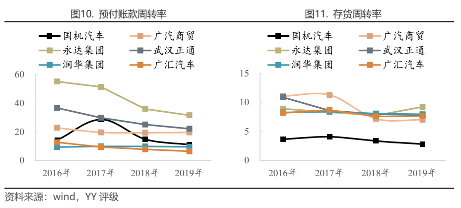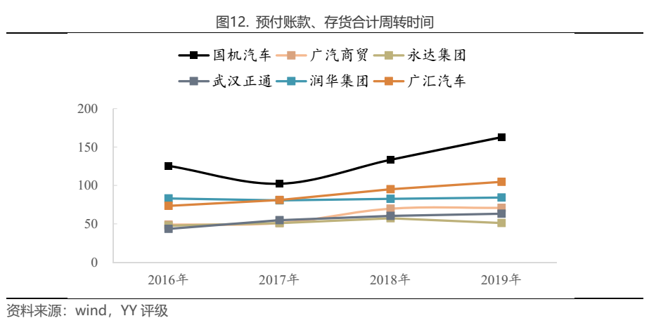 以預付賬款、存貨合計周轉(zhuǎn)時間即購銷完整周期來看(不考慮應收賬款),永達集團周轉(zhuǎn)時間最短,2019年為51.1天,廣汽商貿(mào)、武漢正通19年周轉(zhuǎn)時間也在80天內(nèi),而國機汽車周轉(zhuǎn)時間達162.8天,2017年以來周轉(zhuǎn)顯著減慢。6家企業(yè)平均周轉(zhuǎn)時間約3個月,若剔除國機汽車,周轉(zhuǎn)時間約2個半月。