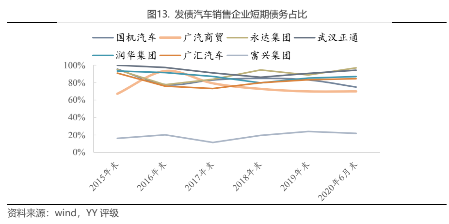 汽車銷售企業(yè)的債務結(jié)構(gòu)呈現(xiàn)出高度短期化特征,7家發(fā)債汽車銷售企業(yè)中除富興集團外,其他企業(yè)的短期債務占比皆在70%以上,平均占比達到75.7%。短期化的融資安排部分是企業(yè)資質(zhì)較弱、長期融資能力差所致,但更主要的是這與其資產(chǎn)期限結(jié)構(gòu)是匹配的。汽車銷售企業(yè)最重要的資產(chǎn)構(gòu)成為營運資本,包括貨幣資金以及汽車購銷中形成的預付款、存貨,流動性較強,上節(jié)計算出預收+存貨的合計周轉(zhuǎn)時間在2.5個月-3個月左右,因此理想的融資結(jié)構(gòu)是用短期債務為這些營運資本融資。且汽車銷售利潤空間本來就窄,用短債替換長債節(jié)省財務成本也是必要的。