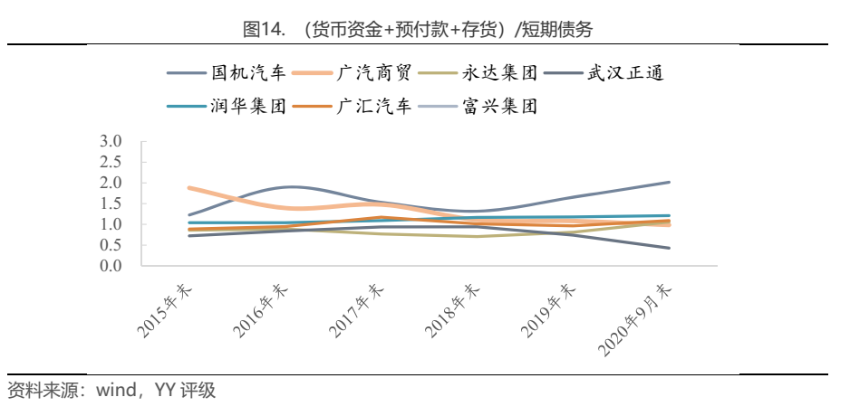 幾家發(fā)債企業(yè)中,除富興集團(貨幣資金+預付款+存貨)/短期債務高達4左右外(富興集團汽車銷售業(yè)務僅展比44.7%,還有房地產(chǎn)等業(yè)務,可比性較差),其他企業(yè)的(貨幣資金+預付款+存貨)/短期債務基本在0-2范圍,其中廣汽商貿(mào)、永大集團、潤華集團、廣匯汽車皆保持在1左右,說明債務期限結(jié)構(gòu)與資產(chǎn)期限結(jié)構(gòu)較匹配。而截至20年9月末國機汽車該指標達到2.02,短期安全系數(shù)較高,而武漢正通該指標下滑至0.43,缺口達51.36億元,意味著其存在以短債滾續(xù)為固定資產(chǎn)、融資租賃款等長期限資產(chǎn)融資的情況,短期償債壓力較大。