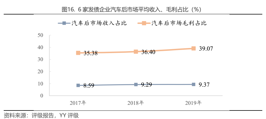 6家發(fā)債企業(yè)平均來看,汽車后市場以約10%的收入占比貢獻了約40%的毛利。且近些年來,無論是收入占比還是毛利占比,都呈現(xiàn)穩(wěn)步提升的態(tài)勢。