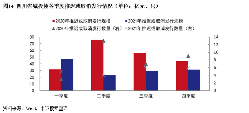 2021年四川省城投公司共推遲或取消發(fā)行債券21只,同比減少11只;涉及計劃發(fā)行規(guī)模130.90億元,同比下降37.01%。受2020年4季度“永煤事件”等信用事件沖擊影響,2021年1季度推遲或取消的債券規(guī)模最大。2021年2-4季度四川省推遲或取消的城投債規(guī)模較為接近,但均少于2020年同期水平,主要系2020年同期城投債發(fā)行利率為歷史低位且波動較大所致。