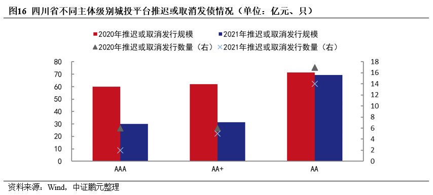 2021年四川省推遲或取消發(fā)行的城投債數(shù)量和規(guī)模較2020年均有下降,但集中在省平臺和成都市,AA主體推遲或取消發(fā)行情況較為多見