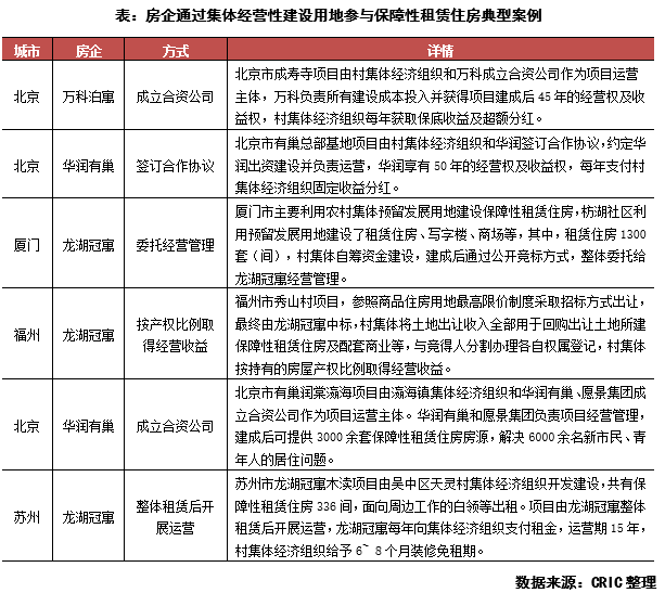 雖然房企參與保障性租賃住房規(guī)模不大,但仍有部分房企積極與政府合作,試水該領(lǐng)域。根據(jù)住建部2021年11月及2022年2月發(fā)布的兩批《發(fā)展保障性租賃住房可復(fù)制可推廣經(jīng)驗(yàn)清單》來看,多家房企通過集體經(jīng)營性建設(shè)用地參與保障性租賃住房建設(shè),這些房企包括萬科泊寓、華潤有巢及龍湖冠寓,參與方式包括成立合資公司、整租后開展運(yùn)營、委托經(jīng)營管理等等。