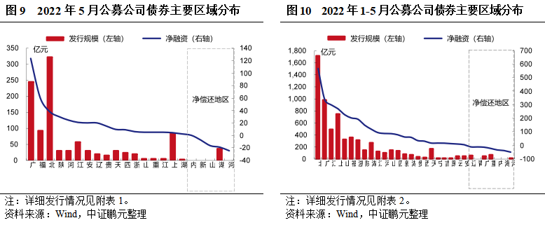 區域分布方面,5月份公募公司債券主要集中于北京、廣東、福建等地,私募公司債券主要集中在江蘇、浙江、河南等地。