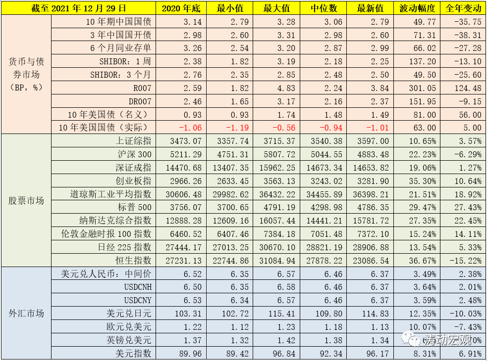 潮起潮落下,一切即將塵埃落定。回望2021年全年,應清醒地認識到,當前全球經濟只是反彈,還未真正復蘇,多數經濟體并未恢復到疫情前水平,一些問題的存在仍然讓人頭疼,如疫情起伏反復嚴重干擾復蘇進程、不同地區復蘇分化發展失衡威脅增長的可持續性、高企的通脹尚未出現緩解跡象(對企業和民眾的困擾需要引起關注),供應鏈產業鏈受阻的“隱患”仍在間歇性發作、新興經濟體和發展中國家對美聯儲政策節奏的變化憂心忡忡等等。過去這一年,雖然中國經濟總量即將邁入110萬億元大關、人均GDP將達到1.20萬美元(逼近高收入國家水準),但我們卻經歷了經濟基本面的倒“V”型反轉和下半年以來的超預期下行,經歷了A股市場近幾年以來表現最為一般的一年(雖然創業板仍在繼續大幅上行以及A股全年成交金額突破2015年的紀錄)以及恒指連續兩年的下挫,亦經歷了2015年以來人民幣匯率波動幅度最小的一年(全年不到4%)。同樣是這一年,美聯儲Taper進程明顯加快以及加息步伐預期明顯提前、美元指數與美債收益率顯著上行、美國三大股指引領全球,中國與美國之間的第二階段博弈在Biden時代的第一年迎來了新的特征以及地緣政治格局博弈愈加劇烈。依然是這一年,我們看到雖然中國經濟在疫情之后率先反彈,但在反彈之后經濟基本面亦比其它經濟體率先進入下行通道(今年1-3季度的當季GDP增速分別為5%、5.50%和4.90%),未來若干年的中國經濟可能均需要為?!?%”而不斷努力,年終政治局會議與中央經濟工作會議則相應提出“穩字當頭、穩住宏觀經濟大盤”的政策基調,并做出“需求收縮、供給沖擊、預期轉弱”的基本判斷,因為政策部門與市場均應認識到,經濟基本面的運行是有慣性的且某種程度上不以人的意志為轉移,經濟增速一旦落下來,就很難再上去,所以現在要讓它落的慢一些、溫柔一些,從這個角度看持續收緊的貨幣環境應已很難重現。還是這一年,城投政策趨嚴與地產行業重塑牽動著整個市場的神經,綠色金融漸成氣候、碳貨幣趨勢愈發明顯,新三板、北交所、創業板與科創板正持續為科創類企業提供加持平臺。