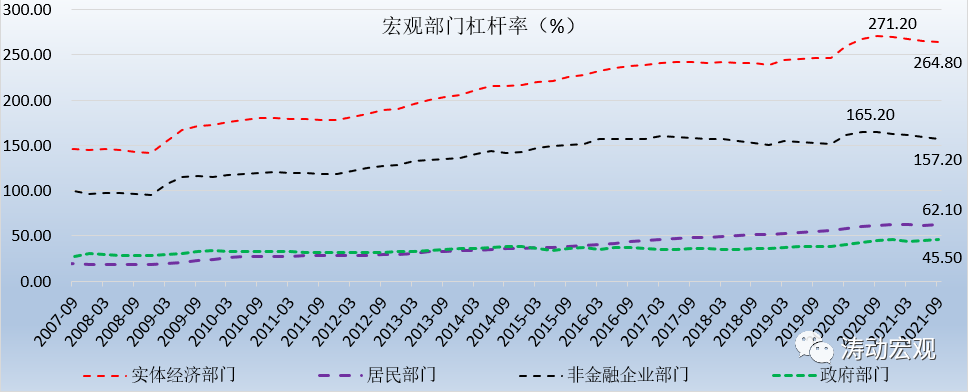 相較于2020年的各部門宏觀杠桿率大幅抬升來說,2021年的宏觀杠桿率則有了一定程度的下降,應該說這為2022的加杠桿創造了空間。從具體看,2020年實體經濟部門、居民部門、非金融企業部門與政府部門的杠桿率分別上升23.60個百分點、6.10個百分點、10.40個百分點和7.10個百分點,2021年前三季度則分別下降了5.30個百分點、0.10個百分點、5.10個百分點和0.10個百分點。
