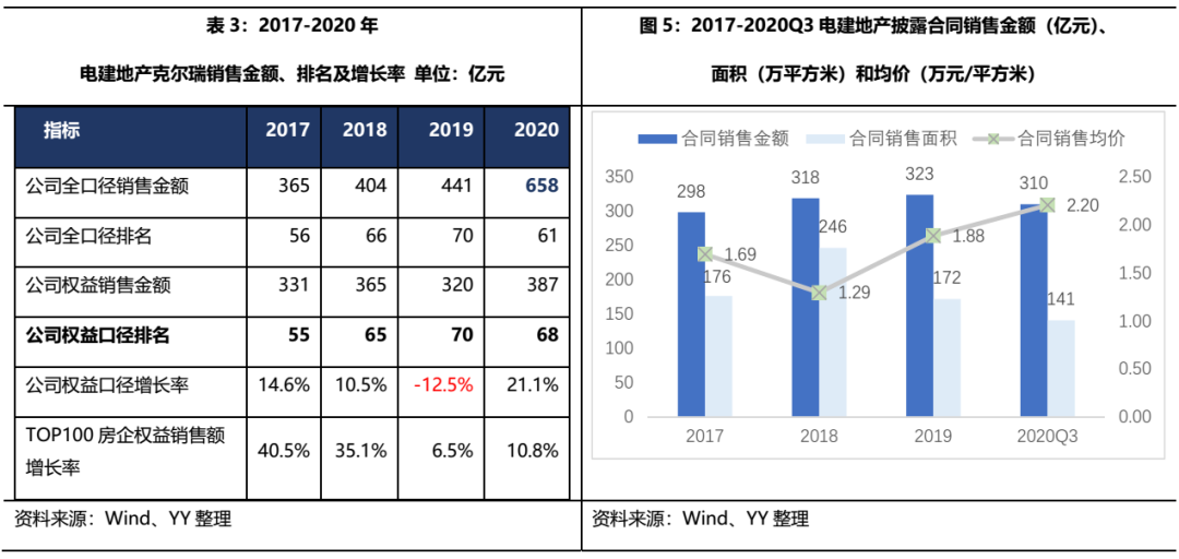 銷售方面,與行業(yè)水平相比,電建地產(chǎn)2017-2019年全口徑和權(quán)益口徑銷售金額排名均有所滑坡,銷售增速也低于TOP100房企的行業(yè)平均水平,但隨著公司2020年下半年開始發(fā)力,各項銷售指標有所提升,公司2020年權(quán)益口徑銷售金額增長217億元。