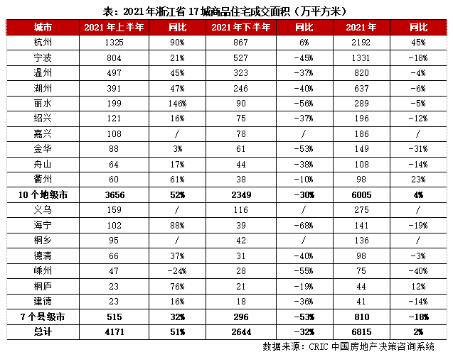 2021年上、下半年,浙江省房地產(chǎn)市場強、弱轉(zhuǎn)折,上半年市場異常火爆,下半年則持續(xù)轉(zhuǎn)冷。據(jù)CRIC監(jiān)測數(shù)據(jù)顯示,上半年浙江省10個地級市商品住宅成交3656萬平方米,同比增長52%,7個縣級市成交515萬平方米,同比增長32%。其中,杭州、海寧等成交顯著放量,同比漲幅都在90%附近,麗水更是翻倍增長。下半年10個地級市成交跌至2349萬平方米,同比下降30%;7個縣級市成交降至296萬平方米,同比下降53%。其中,金華、海寧等市場持續(xù)低迷,成交同比腰斬。