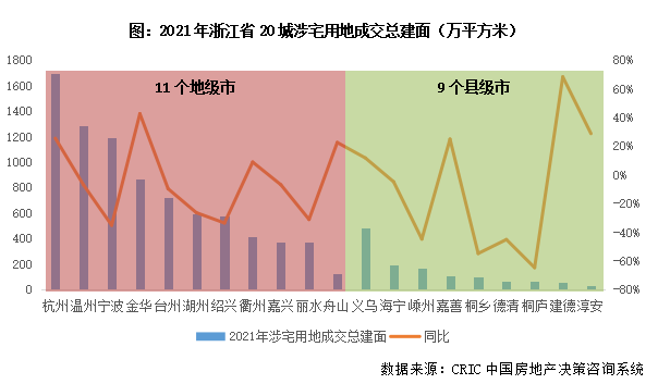 展望2022年,浙江省房地產(chǎn)市場前景很大程度上將取決于供求關系,聯(lián)系到近兩年浙江省涉宅用地成交規(guī)模持續(xù)下行,預計房地產(chǎn)市場仍將實現(xiàn)供求平衡。2021年,浙江省11個地級市涉宅用地成交總建面8230萬平方米,同比下降10%,9個縣級市涉宅用地成交總建面1262萬平方米,同比下降21%。