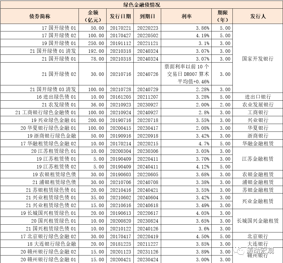 (2)目前股份行中有3家銀行有存續綠色金融債(分別為興業銀行、華夏銀行和浙商銀行);城商行中有24家銀行有存續、農商行中有15家銀行有存續;全國性銀行僅1家有存續(工行);非銀金融機構有7家有存續,且均為金融租賃公司,分別為江蘇金融租賃、華融金融租賃、農銀金融租賃、浦銀金融租賃、蘇銀金融租賃、興業金融租賃和長城國興金融租賃。
