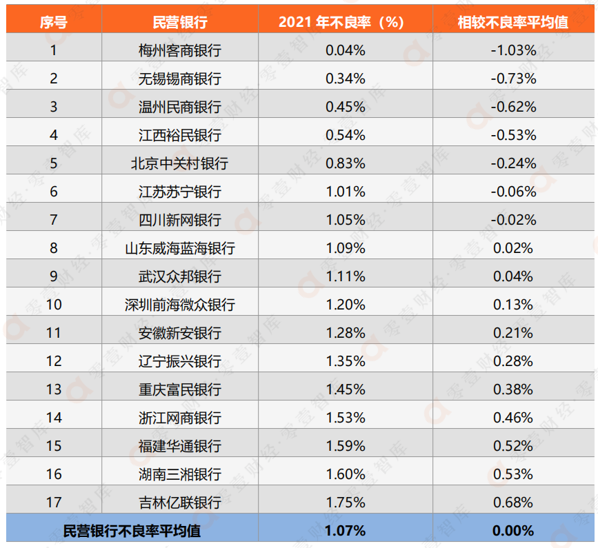 1、上表列出17家民營(yíng)銀行的不良率數(shù)據(jù),此外有2家未披露:一是上海華瑞銀行,尚未發(fā)布2021年報(bào);二是天津金城銀行,未披露2021年度不良率數(shù)據(jù);