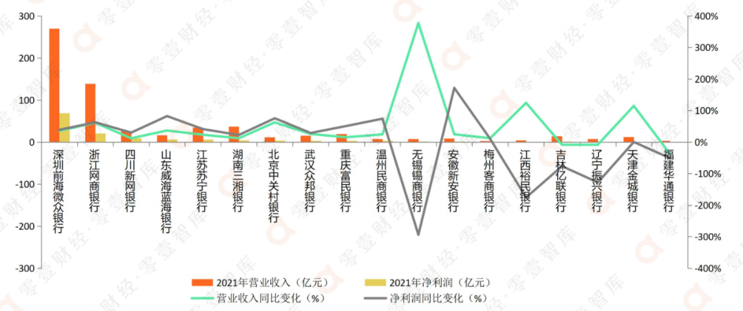圖 3:18家民營(yíng)銀行2021年度營(yíng)業(yè)收入與凈利潤(rùn)分析(單位:億元、%)