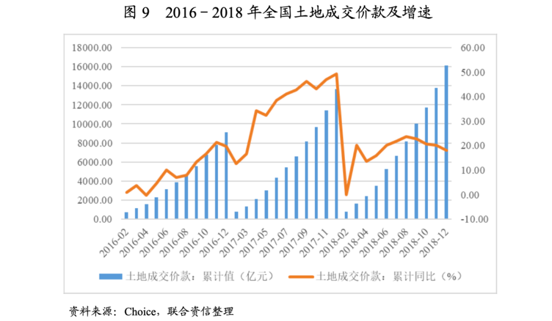 土地市場方面,隨著房地產(chǎn)市場政策趨緊,房企拿地普遍持謹慎態(tài)度。據(jù)中指研究院數(shù)據(jù),2018年全國300個城市共推出各類用地12.84億平方米,同比增長20%;土地成交量10.55億平方米,同比增長14%。進入2018年以來,土地出讓政策頻出,部分城市限房價、限地價、競自持、競配建等土地出讓條件嚴苛,房企的利潤空間被壓縮;同時,限購、限貸款等調控城市范圍增大,部份購房需求被抑制,銷售增速放緩,房企回款壓力較大;加之房企融資渠道持續(xù)收緊,拿地更趨理性,土地成交規(guī)模增速不及供地增速,土地流拍情況較2017年明顯增加。價格方面,2018年,全國土地成交價款1.61萬億元,同比增長18.00%,增速同比減少31.40個百分點;300個城市成交樓面均價為2156元/平方米,同比下跌11%;平均溢價率為13%,同比下降16個百分點。但部分房企為沖規(guī)模,依然高溢價拿地,部分高溢價項目樓面地價接近政府限價。
