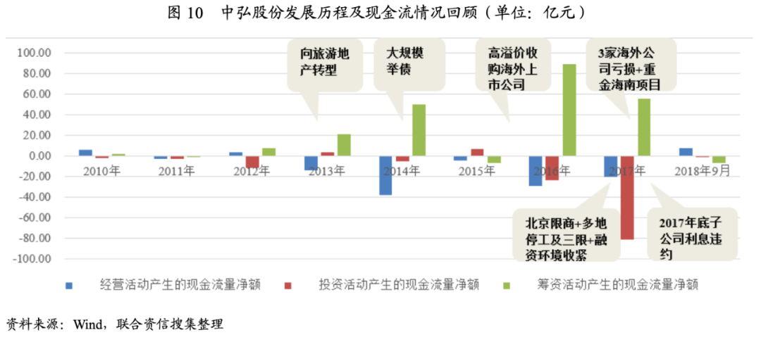 我們將中弘股份戰(zhàn)略轉型的時間節(jié)點和現(xiàn)金流情況進行對比,回顧其發(fā)展歷程我們可以發(fā)現(xiàn):公司一直采取了較為激進的發(fā)展戰(zhàn)略,經(jīng)營活動現(xiàn)金流持續(xù)凈流出并高度依賴外部籌資活動;2017年行業(yè)外部環(huán)境快速收緊對公司銷售及融資造成了巨大的沖擊,舉債擴張的模式難以維繼,具體情況如下圖所示。