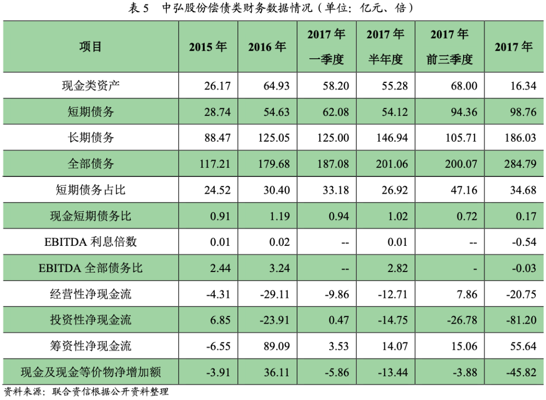 中弘股份在建及擬建項目主要為商住及文旅項目,去化速度較慢且受政策影響較大,受北京商辦類項目及海口填圍海項目政策收緊影響,中弘股份京內(nèi)商住項目及海南如意島等項目銷售停滯;疊加中弘股份因經(jīng)營不善致使山東及浙江等地的多個項目處于停工狀態(tài),2017年以來銷售額大幅下滑,經(jīng)營性現(xiàn)金流對業(yè)務支撐不足。受銷售大幅下降影響,中弘股份現(xiàn)金類資產(chǎn)大幅下滑且現(xiàn)金短期債務比處于極低水平,中弘股份的資金鏈已經(jīng)極其緊張。