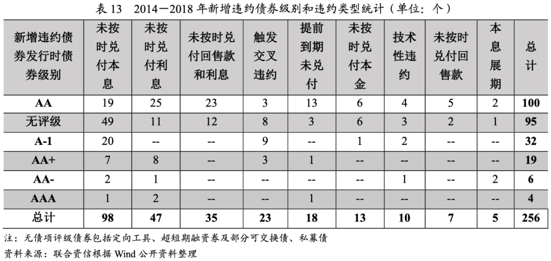 各年份違約主體違約前信用評級呈現(xiàn)明顯的遷移態(tài)勢,2014年違約主體的信用評級較低,或無信用評級,隨后違約主體信用級別逐漸升高和分散化,直至2017年,級別最高的違約債券違約前主體信用評級提高至AA+,2018年,幾乎各個級別都出現(xiàn)了違約情況。