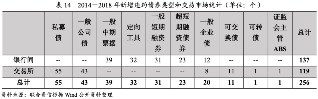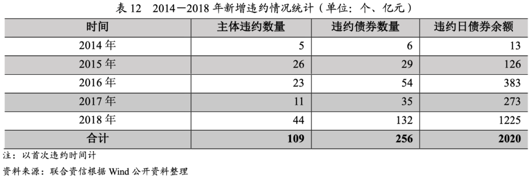 自2014年1月1日至2018年12月31日,交易所和銀行間市場共計109個主體違約,涉及256只債券,違約主體數(shù)量和違約日債券余額整體呈波動增長態(tài)勢,其中2017年由于產(chǎn)能過剩、行業(yè)盈利和融資環(huán)境好轉,新增違約情況有所下降,2018年由于外部信用環(huán)境收縮,債券市場違約數(shù)量和涉及的債券規(guī)模遠超往年,且單個違約發(fā)行人涉及的債券規(guī)模高。