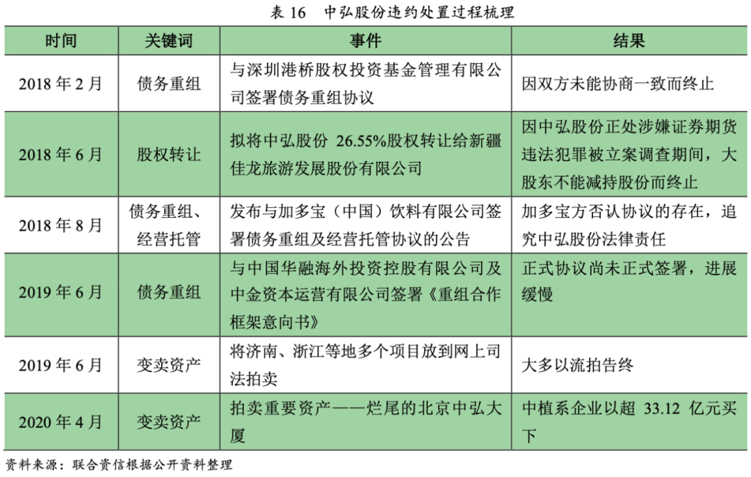 總結:違約后,中弘股份雖積極采取債務重組等多種方式自救,但重組進度極為緩慢,最終能否成功仍存在較大不確定性。目前中弘股份在建房地產(chǎn)項目均處于停工狀態(tài),仍有大量債務本息逾期和訴訟、仲裁事項未能解決,最終能否順利解除債務危機仍無定論。