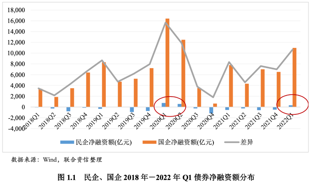 自2018年以來,民營企業債券凈融資額的變化以及其與國企的差異反映出其整體在外部融資環境的負面沖擊下,所面臨的融資難困境。2018年-2022年1季度,民企債券凈融資額除2020年上半年和2022年一季度短暫為正外,其余季度均為負值,特別是各年的下半年,民企凈融資額負值均較大;而同期國企凈融資額均為正值,特別是民企為正值時,國企凈融資更高,兩者分化進一步加劇。這說明市場整體環境較差、外部融資環境負面沖擊較大時,民企融資非常困難;市場環境放松時,民企融資雖然好轉,但從獲利力度上不如國企。