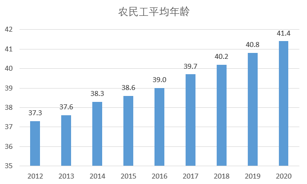 10年前的農民工平均年齡為37.3歲,而到了2020年,農民工的平均年齡已經上升到了41.4歲,且呈現出年齡加速上升的趨勢。