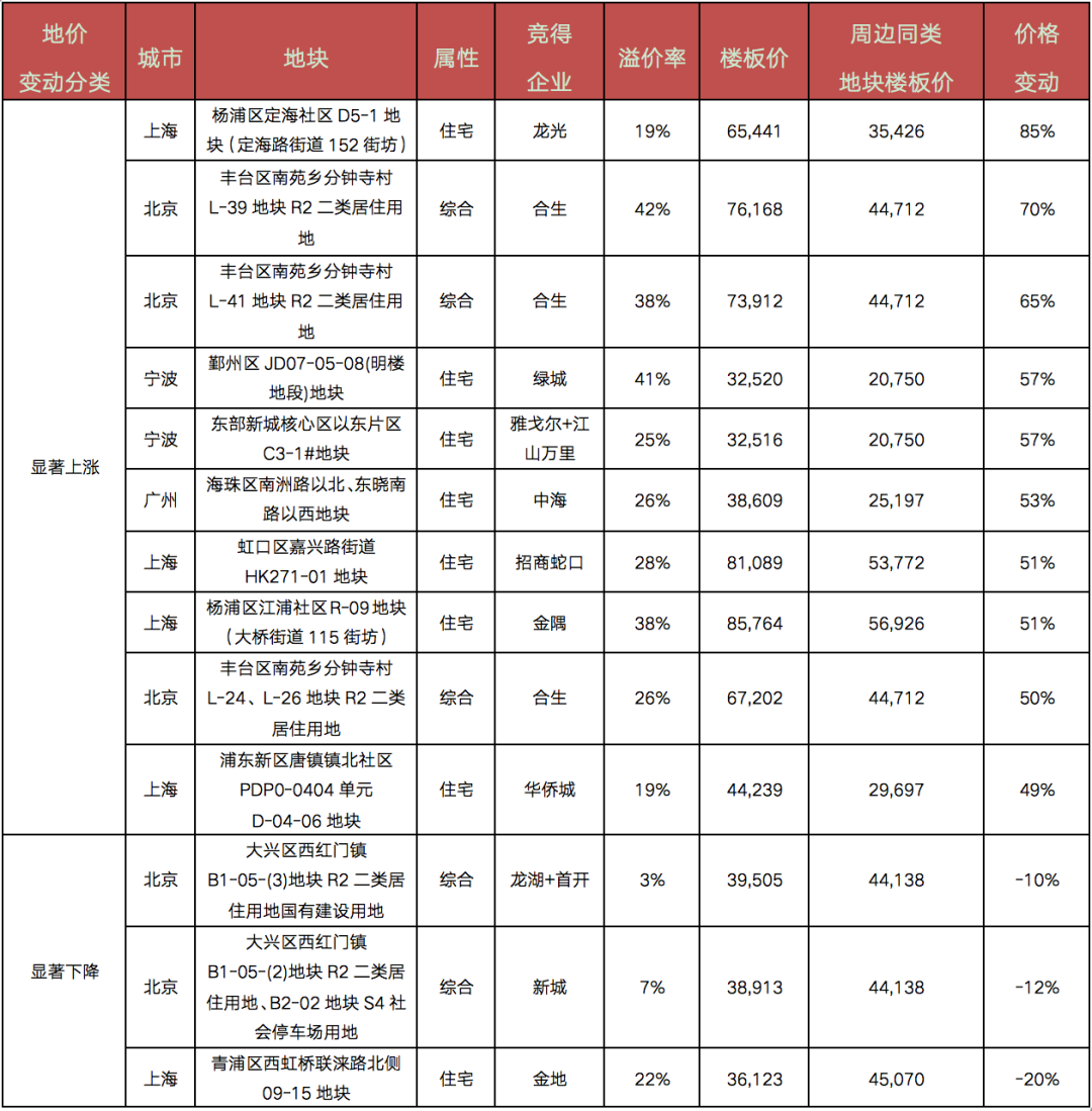 TOP50高價地中,僅有3幅地樓板價較周邊同類地塊價格下降,降幅均在20%以內。