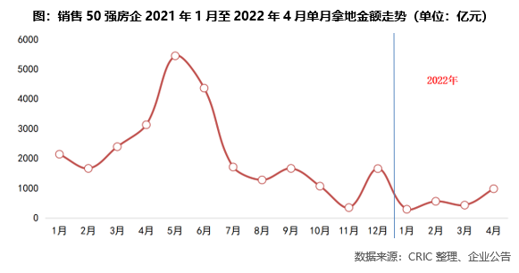 在多個熱點城市首輪集中供地開啟之下,房企單月拿地金額略有回升。銷售TOP50房企單月拿地金額接近1000億元,環比上漲127%,但同比依舊下跌69%。整體來看,前四月,有超過三成TOP50房企未拿地,市場下行、資金緊張帶來的投資壓力并沒有隨著部分城市土拍火熱而幅好轉。