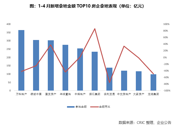 拿地金額TO20中,超過半數是國企、央企,僅有碧桂園、龍湖、濱江、大家等少數民企。華潤、建發、中海等拿地金額均超過250億元。由此可見,當前規模化的國央企如華潤、中海、保利、中交、建發等在核心城市拿地優勢較大,尤其是部分集中供地城市”讓利“之下,優質、高性價比地塊補充可售貨值的同時,也優化了企業土儲結構。民企中,受益于集中供地,一些區域深耕的房企表現較為突出。如濱江、大家等在杭州均收獲頗豐。其中濱江1-4月新增拿地金額233.8億元,同比增長86%,拿地幾乎全部集中在杭州。