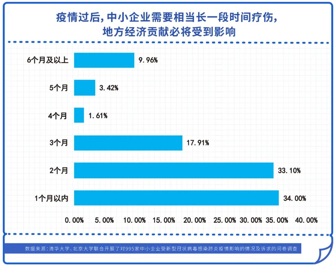 據清華大學、北京大學聯合開展了對995家中小企業受新型冠狀病毒感染肺炎疫情影響的情況及訴求的問卷調查顯示:超過三分之二的被調查企業現金流撐不過2個月,85%的企業撐不過3個月。