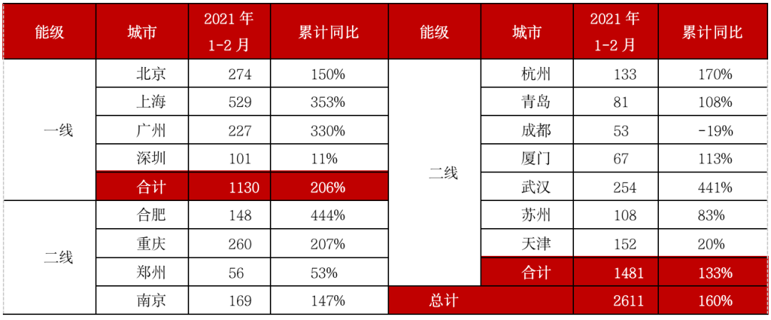 而受去年同期基數較低、各城市分化加劇等方面影響,二線城市成交面積為1481萬平方米,同比增長133%。其中合肥和武漢前2月成交量增至148萬平方米和254萬平方米,同比翻4倍以上,15城中僅成都二手房成交同比為負。