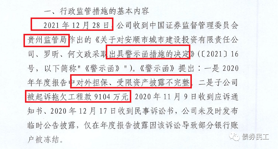 安順市城市建設(shè)投資有限責(zé)任公司發(fā)布(以下簡(jiǎn)稱“安順城投”)于2022年1月13日披露公告,因2020年年度報(bào)告中對(duì)外擔(dān)保和受限資產(chǎn)披露不完整及重大訴訟未披露臨時(shí)公告等原因,被貴州證監(jiān)局采取出具警示函措施。