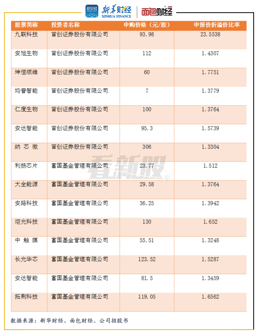 其中,首創(chuàng)證券和富國(guó)基金分別對(duì)7個(gè)和8個(gè)科創(chuàng)板新股報(bào)出明顯高價(jià),高出其最終發(fā)行價(jià)超三成。