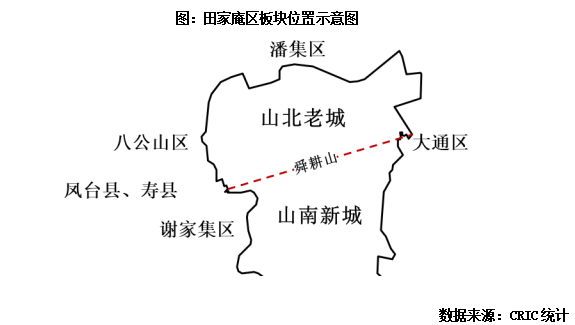 淮南主城區田家庵區以舜耕山為界,劃分為山北老城和山南新城兩個板塊。周邊相接壤的潘集區、大通區、八公山區和謝家集區。其中八公山區和謝家集區煤礦資源已枯竭,購買貧瘠;鳳臺縣和壽縣相對獨立。主城區主力購房客群以潘集區和田家庵區兩區為主。