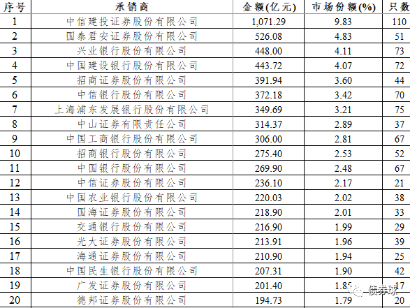 2019年民企信用債承銷前20名情況表