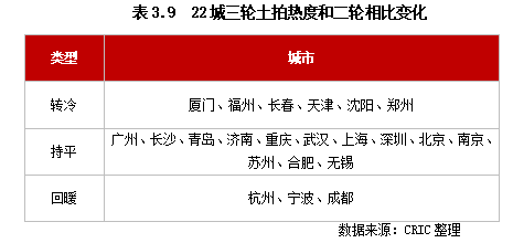 作為房企投資的重點城市,在出讓門檻降低、利用地方國企托底等手段干預下,大部分城市第三輪土拍表現(xiàn)較為平穩(wěn),熱度較第二輪無太大變化。